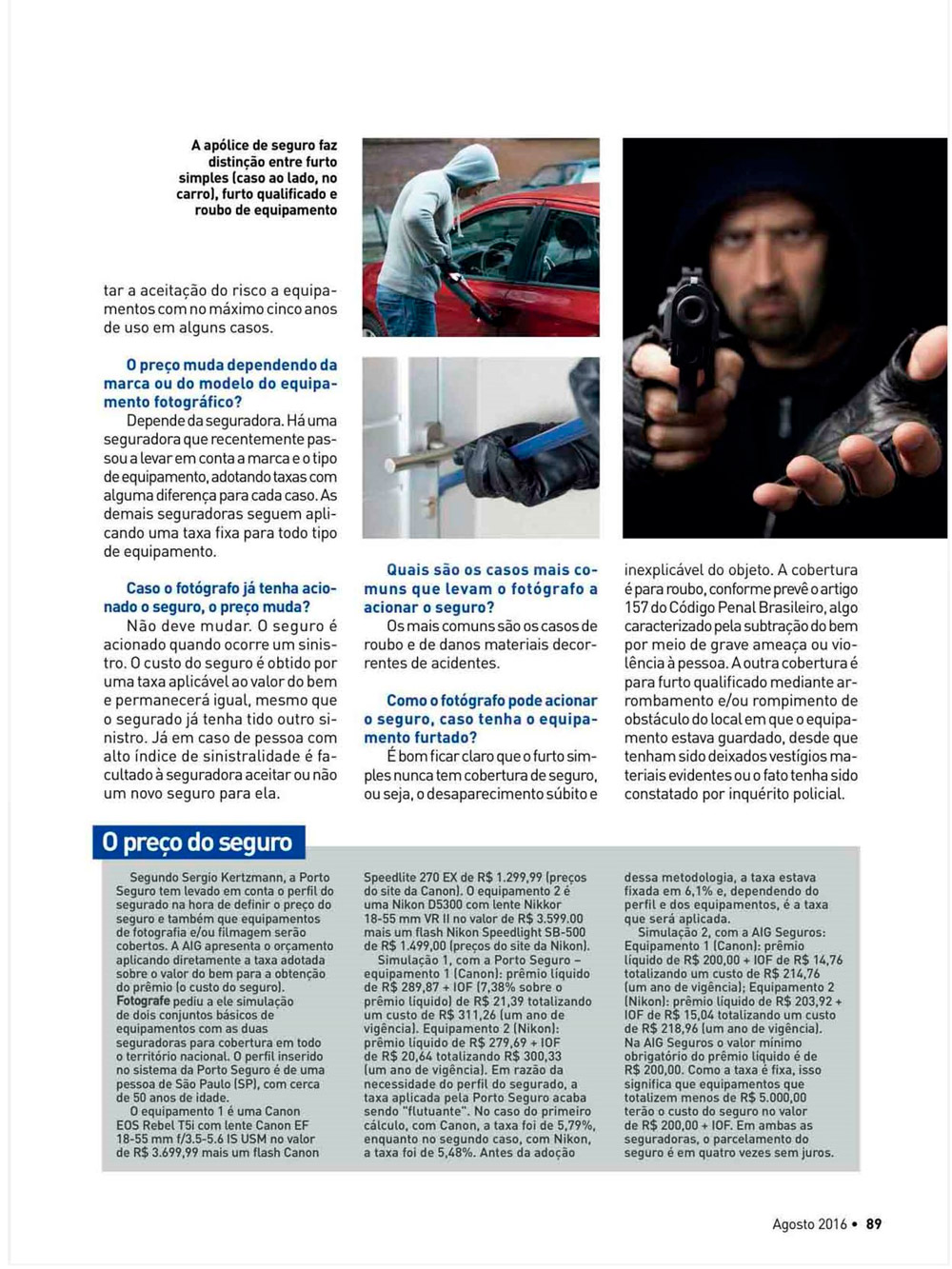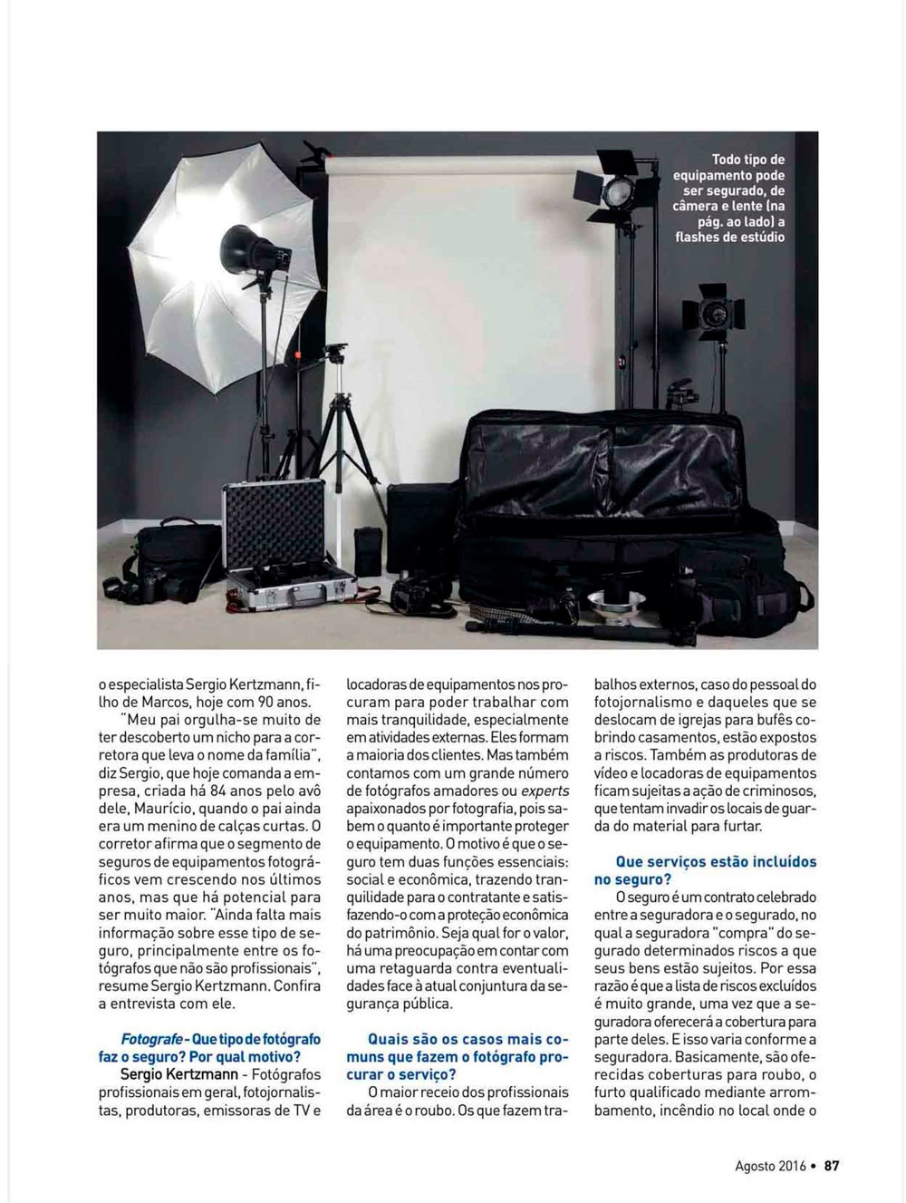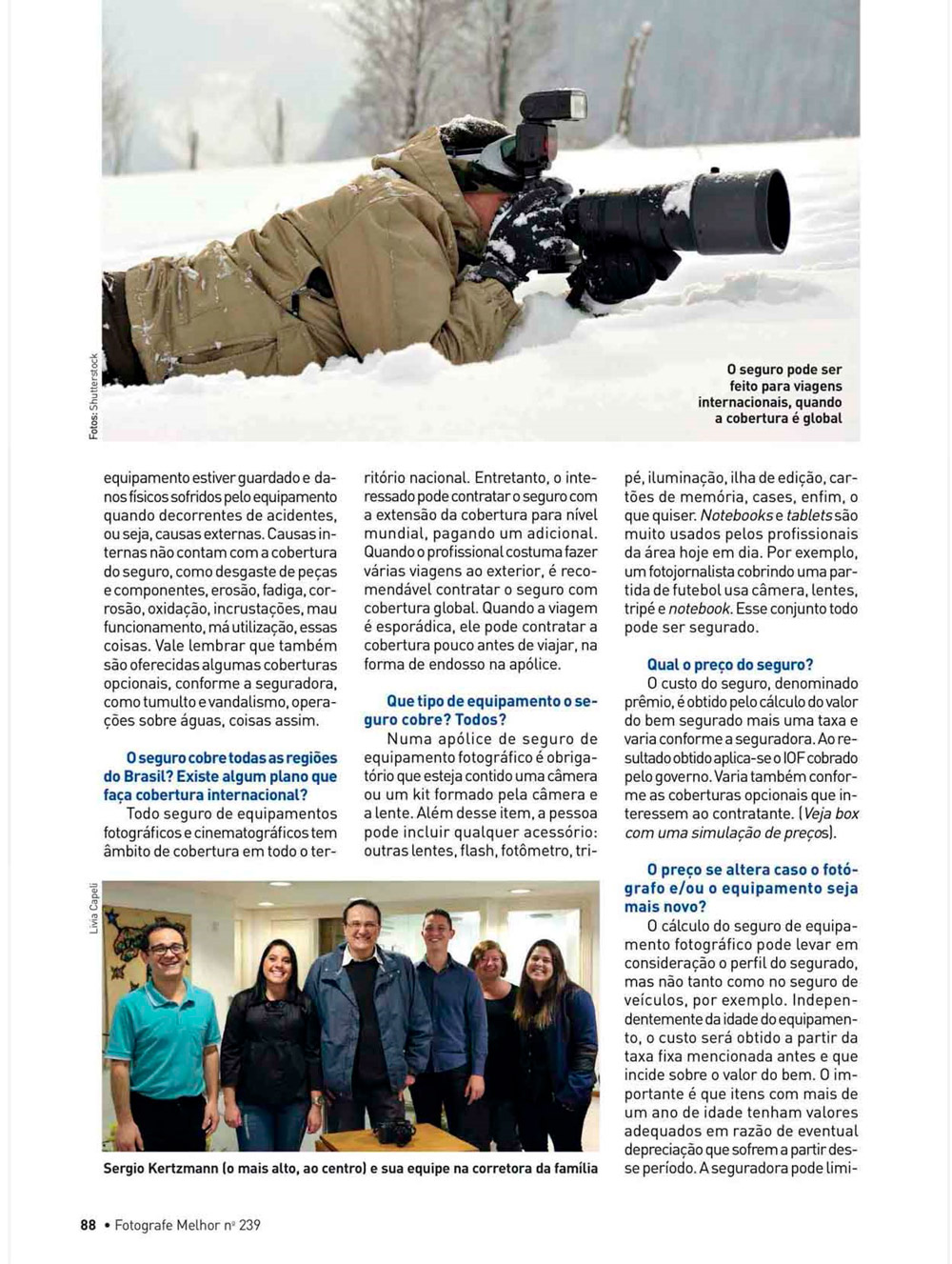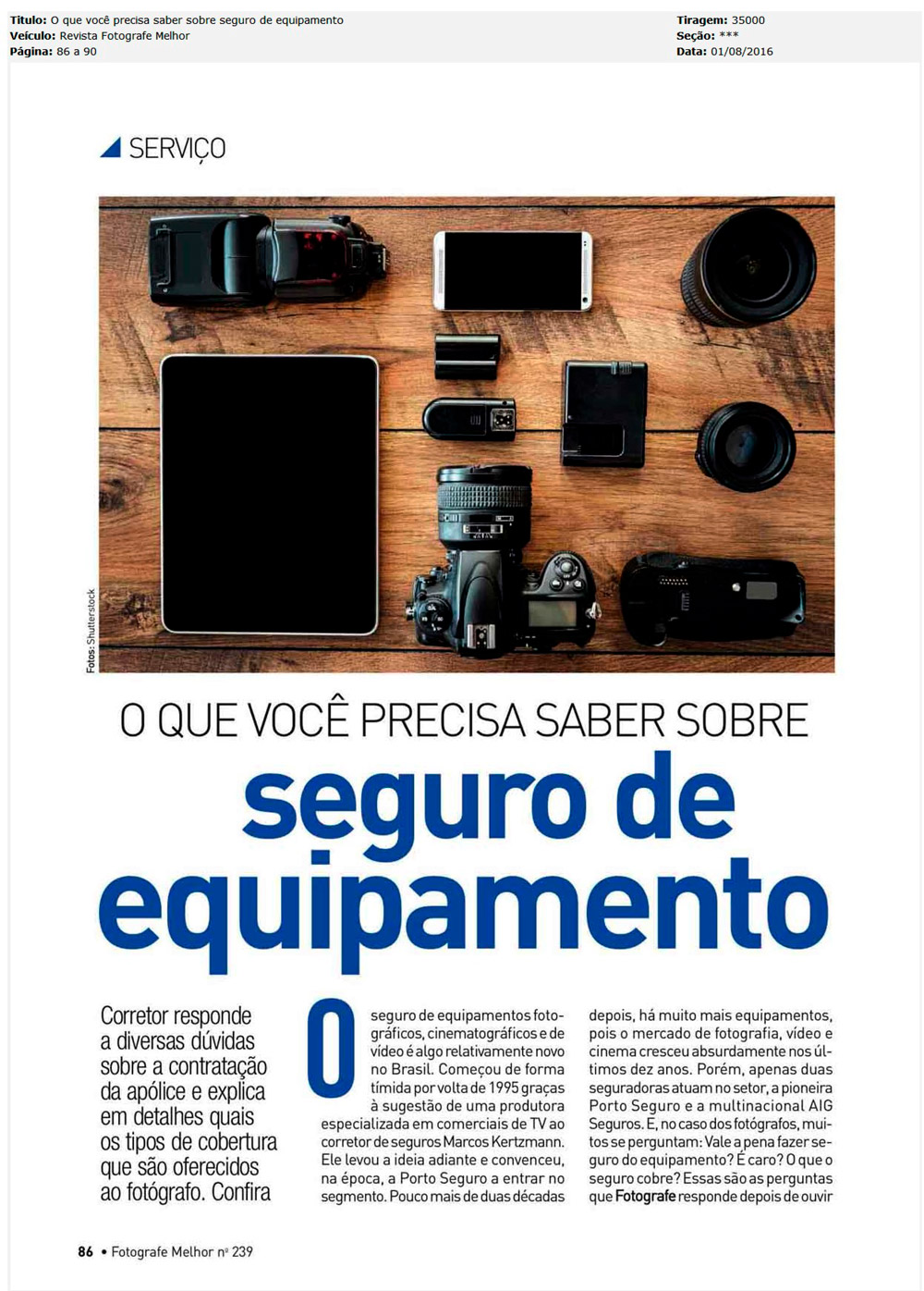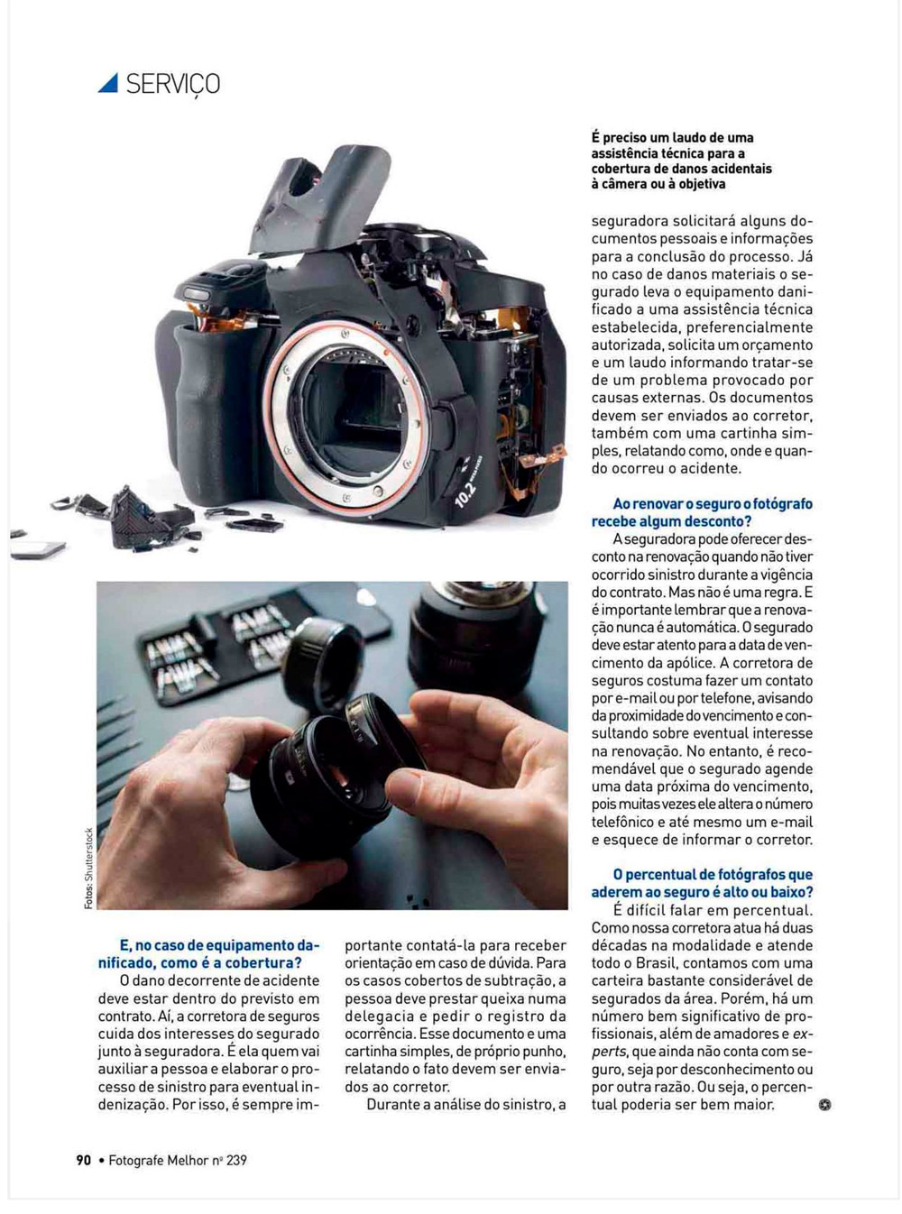A revista FOTOGRAFE MELHOR, da Editora Europa, é uma das melhores publicações que os profissionais e apaixonados desta atividade dispõem no mercado. Na edição 239, além do belo ensaio, do teste com a Sony A6300, dicas gerais e matérias interessantes, abordaram a importância da contratação do seguro, em matéria de cinco páginas, na qual pudemos colaborar respondendo diversas questões levantadas.